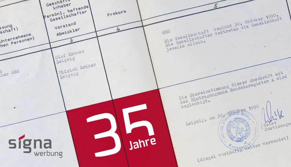Am 30. Oktober 1990, erfolgte im Leipziger Handelsregister die Eintragung der Firma SIGNA Werbung Krause & Kräker OHG beglaubigt mit einem Stempel der Deutschen Demokratischen Republik. Etwas blauäugig – aber optimistisch – haben wir, Olaf Krause und Ulrich Kräker, den Schritt in die Selbständigkeit gewagt. Wenn wir nun auf die 35 Jahre zurückblicken, sehen wir eine tolle Entwicklung unseres Zweimannbetriebes von damals, die wir uns nicht erträumt hatten.
